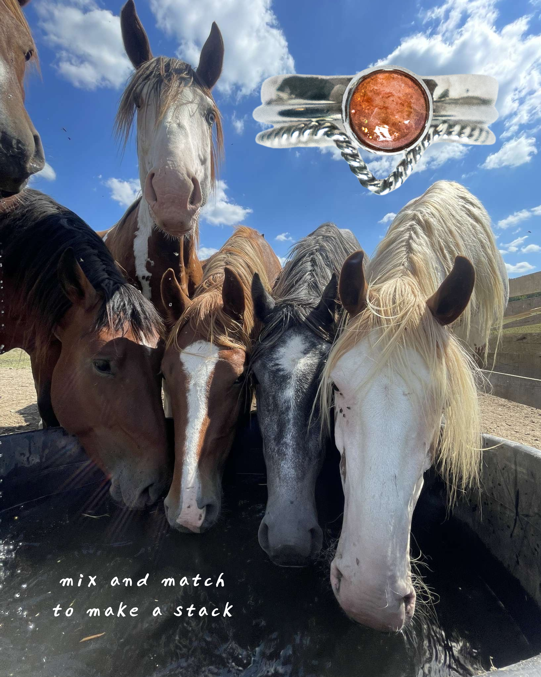 Hand-forged from solid sterling silver, this stack ring features a lightly hammered finish that catches the light like sun on stone. Each strike adds a layer of texture and story, giving the piece a wild, worn-in feel—perfect for stacking or wearing solo.