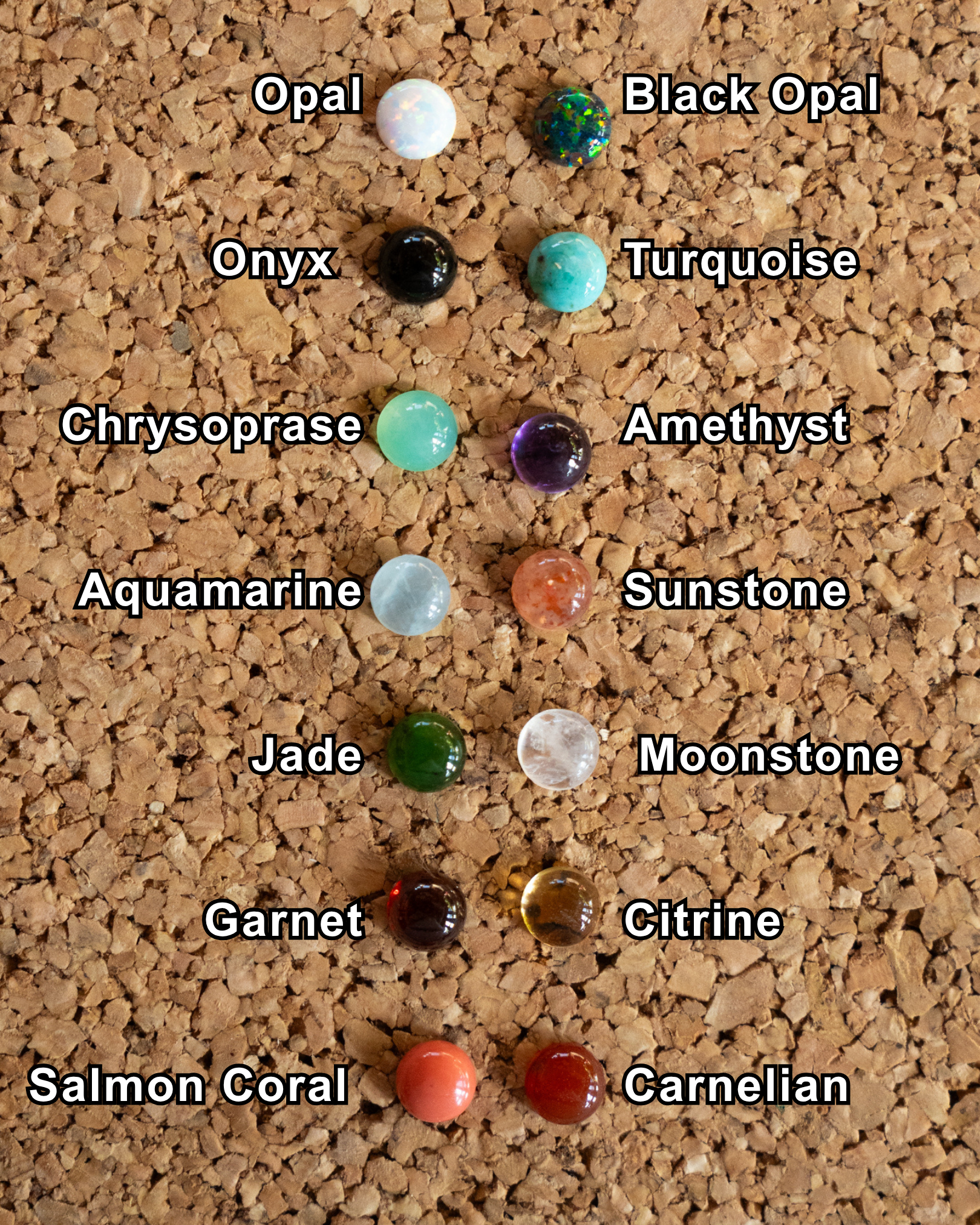 Black Opal, Opal, and Salmon Coral are lab grown.