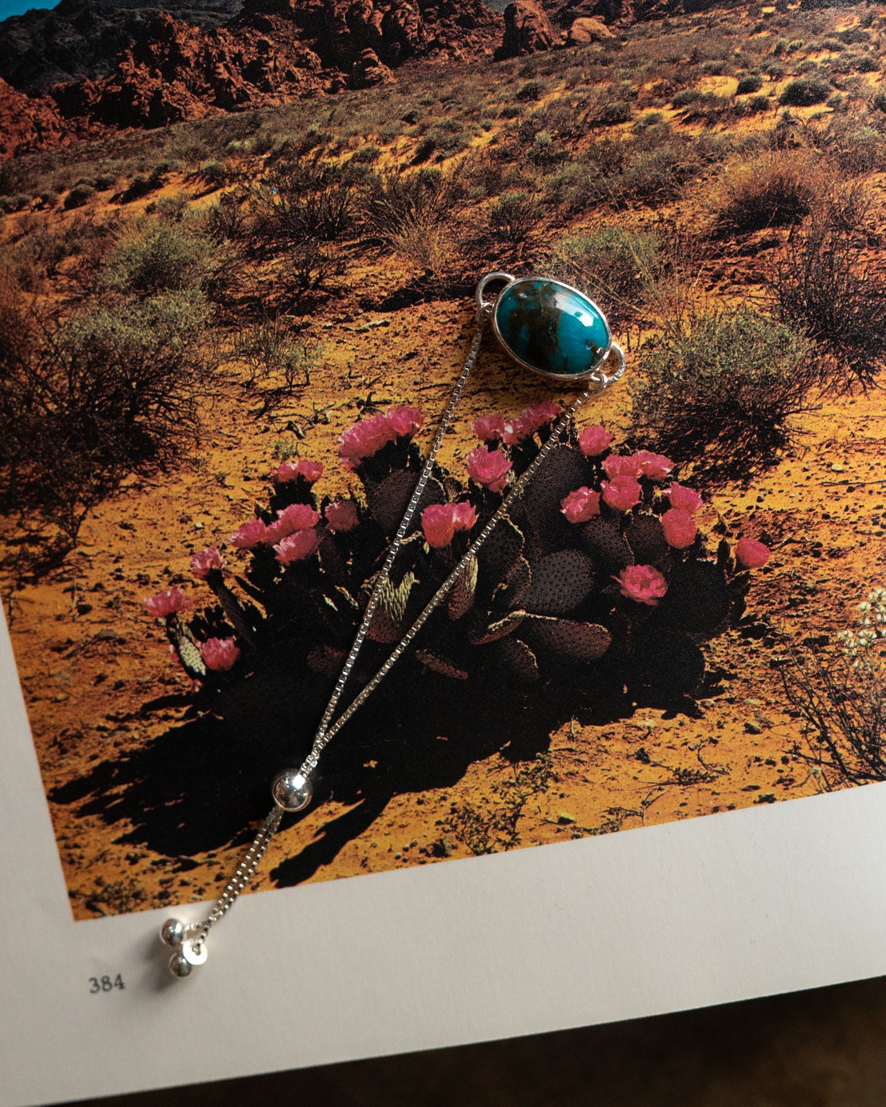 A dainty beauty with the perfect touch of sparkle. This Chrysocolla and sterling silver slide bracelet features a smooth, silicone-lined bead that glides effortlessly along the chain, allowing you to tighten or loosen it for the perfect fit. Delicate dangling accents catch the light with every move, giving the bracelet a soft, subtle shimmer.
