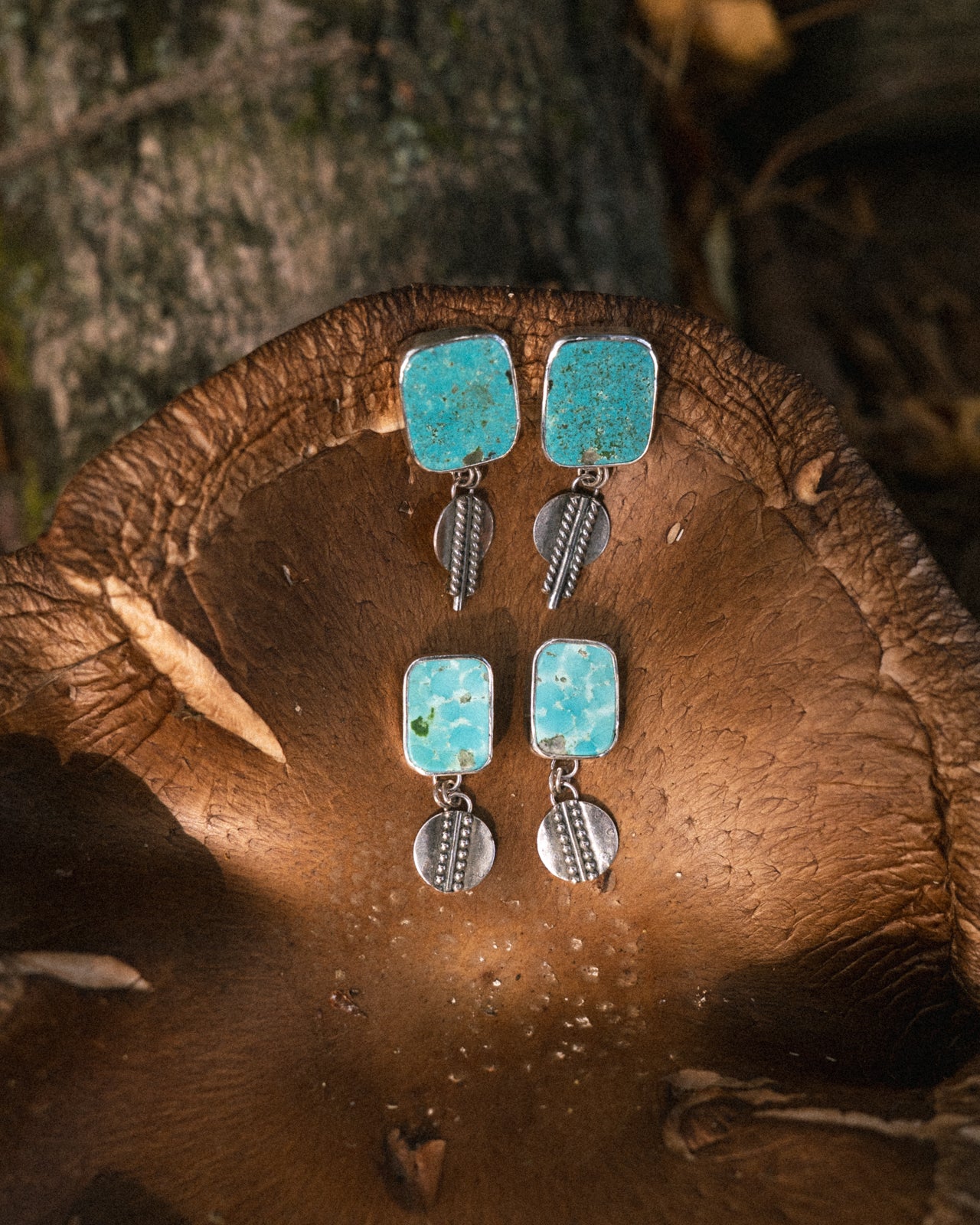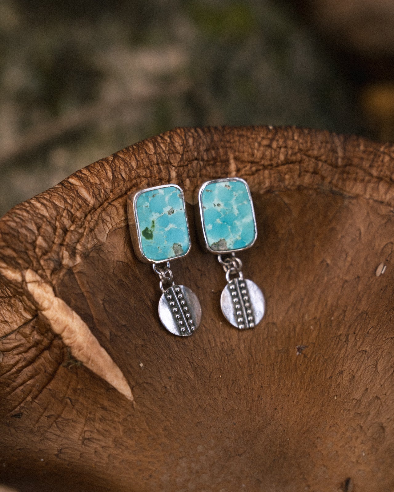 Inspired by the strength and flow of the wild west, the Three Rivers Studs feature bold, chunky Kingman turquoise set in handcrafted sterling silver. Below each turquoise stone hangs a silver disc accent with hand-soldered wire details — giving these earrings just the right amount of movement and shine.