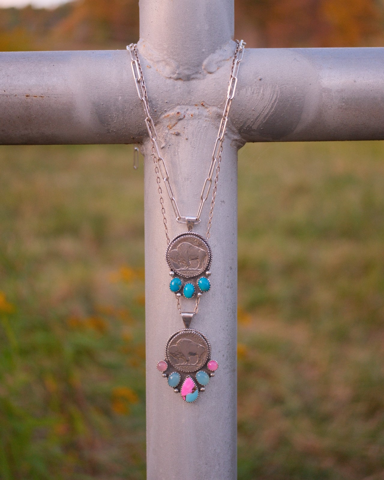 A true one-of-a-kind statement piece. This necklace is handcrafted from sterling silver and features an authentic Buffalo nickel paired with the dreamy pastel tones of Cotton Candy Dahlia and Chalcedony. Finished with your choice of chain or strung on your own favorite 3mm Navajo pearls for that classic western touch.