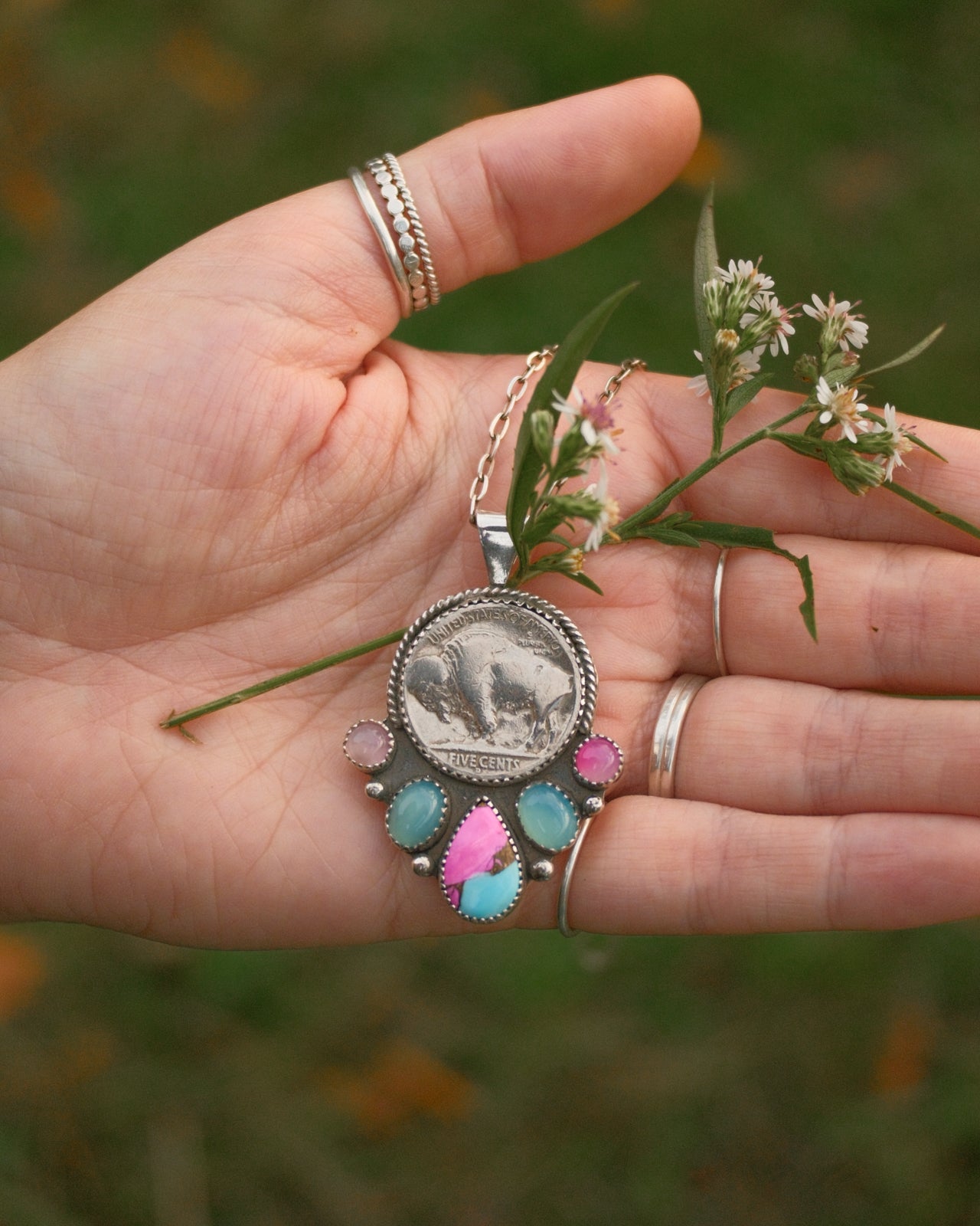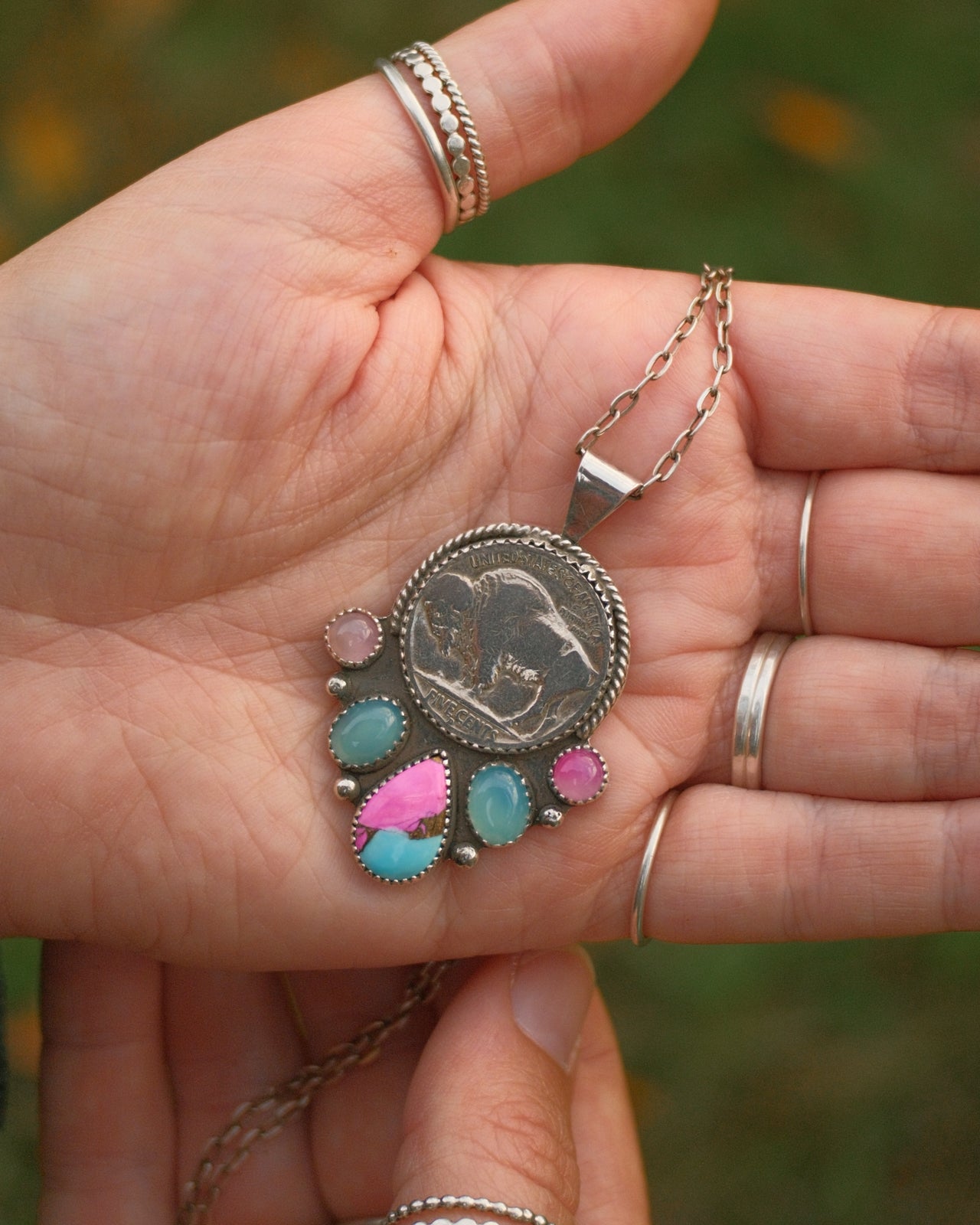 Buffalo Nickel Necklace – Cotton Candy Dahlia & Chalcedony